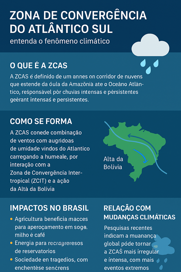 A Zona de Convergência do Atlântico Sul é um fenômeno essencial para o equilíbrio climático do Brasil. Ela garante chuvas fundamentais para a agricultura e energia, mas também representa riscos quando se intensifica. Com as mudanças climáticas, compreender e monitorar a ZCAS torna-se cada vez mais importante para prevenir desastres e proteger vidas.