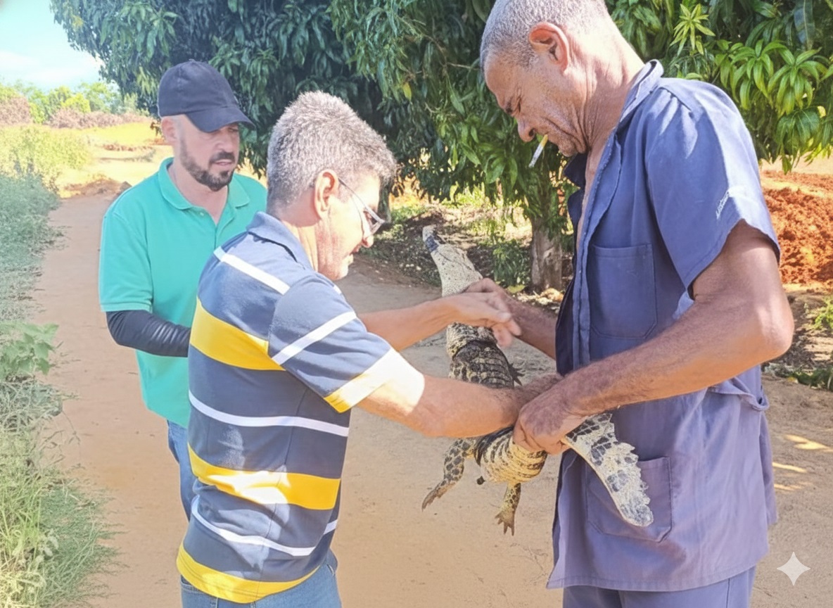 Nesta quinta-feira (8), um jacaré-do-papo-amarelo (Caiman latirostris), espécie encontrada no sudoeste baiano, foi recolhido da Lagoa Zinho Tanajura — hoje urbanizada como Balneário Municipal — e levado para uma lagoa ao lado, conhecida como Lagoa do Amâncio, de pouco impacto urbano. A medida buscou reduzir riscos à população que frequenta o balneário e, ao mesmo tempo, garantir que o animal permanecesse em um ambiente seguro e mais adequado.
