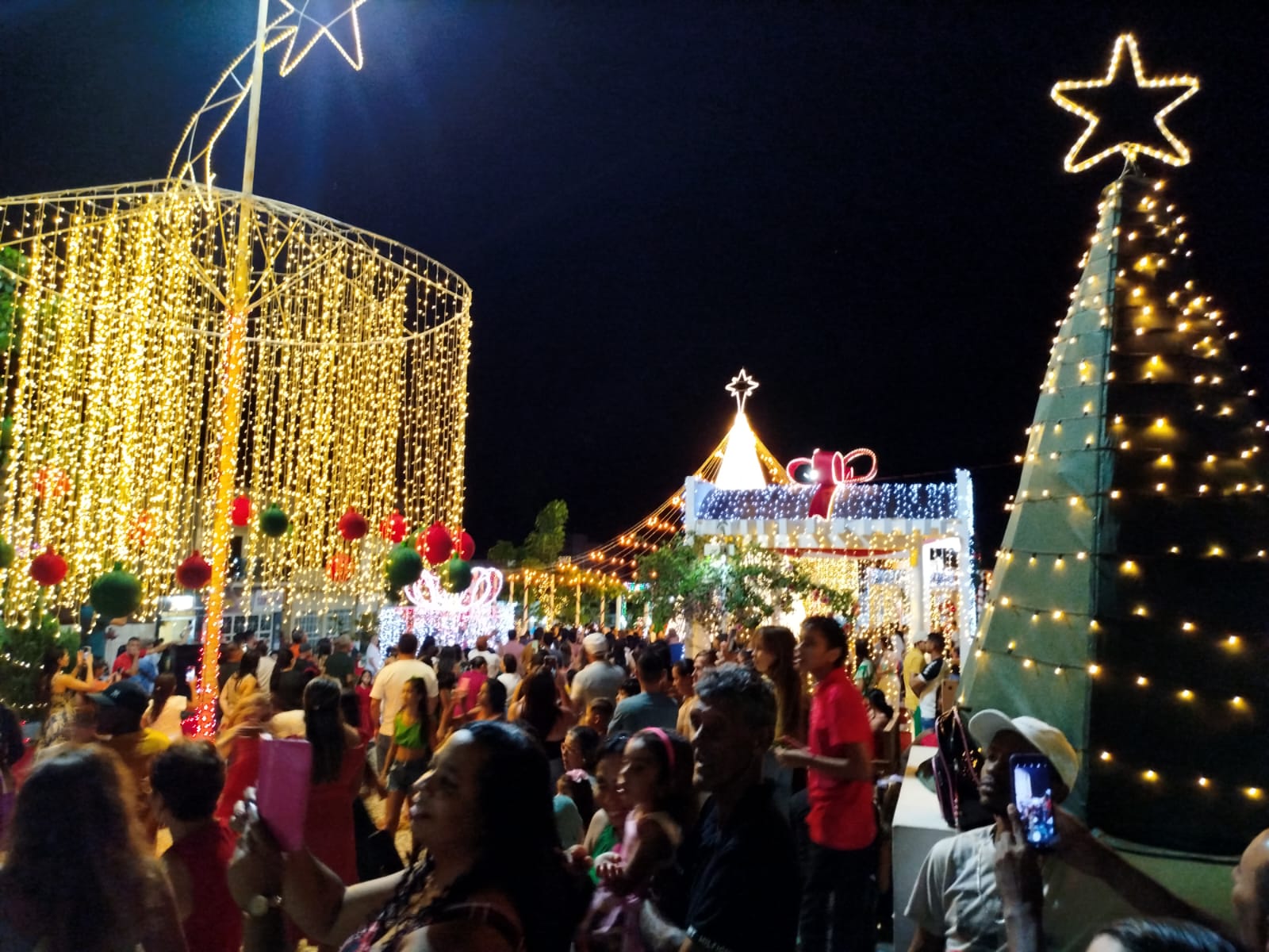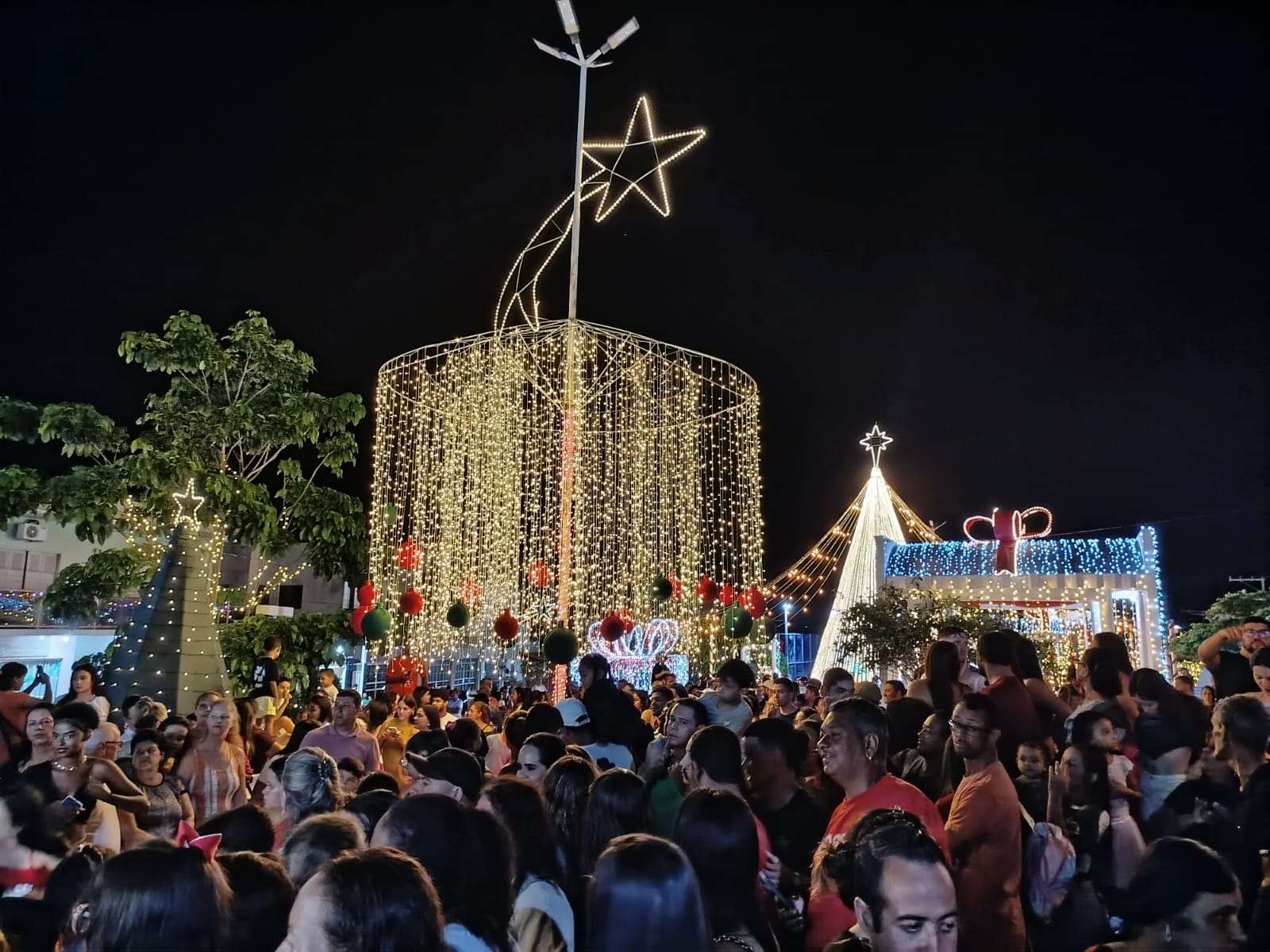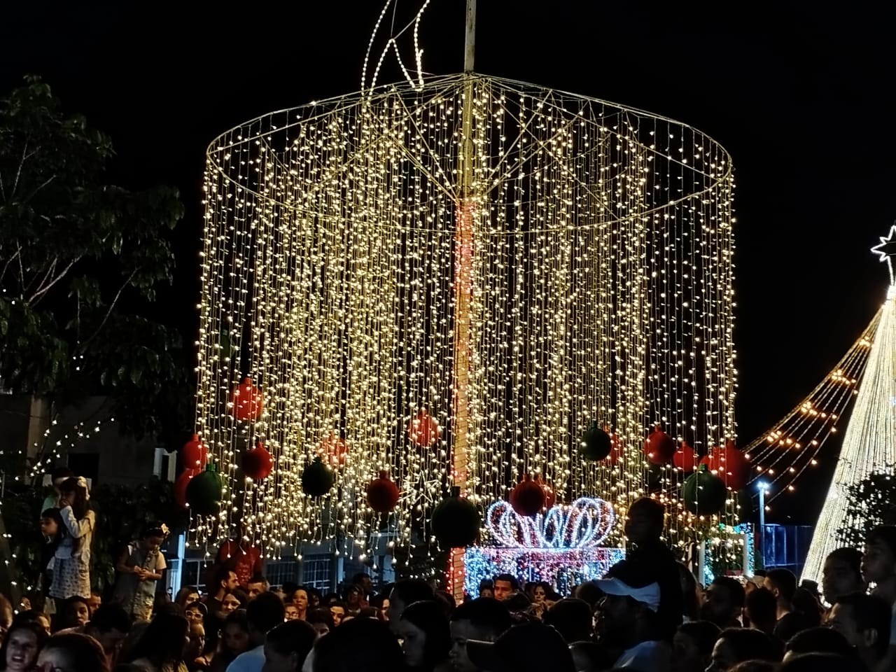 Centenas de moradores se reuniram para acompanhar a inauguração da decoração de Natal, que transformou a principal praça da cidade em um cenário especial.
